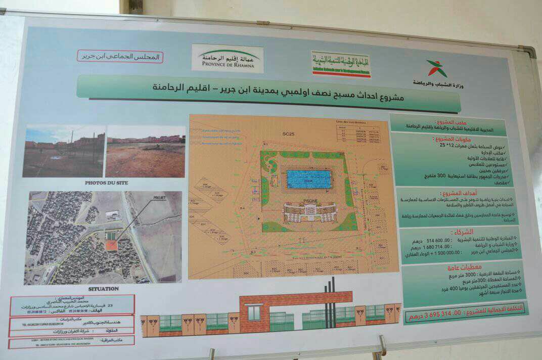 أعطى السيد عزيز بوينيان عامل إقليم الرحامنة رفقة السيد مولاي أحمد القاسمي المدير الإقليمي لوزارة الشباب و الرياضة اليوم الأربعاء 31 يناير 2018 ،انطلاقة أشغال مشروع إحداث مسبح نصف أولمبي بحي المجد بإبن جرير ،على مساحة تقدر ب 3000 متر مربع منها 300 متر مربع مغطاة تشمل على حوض للسباحة بثمان ممرات (12 على 25 ) وعلى مستودعيين للملابس وقاعة للعلاجات الأولية و مرفقين صحيين ومكتب الادارة إلى جانب مدرجات خاصة بالجمهور بطاقة إستعابية تبلغ 300 متفرج .