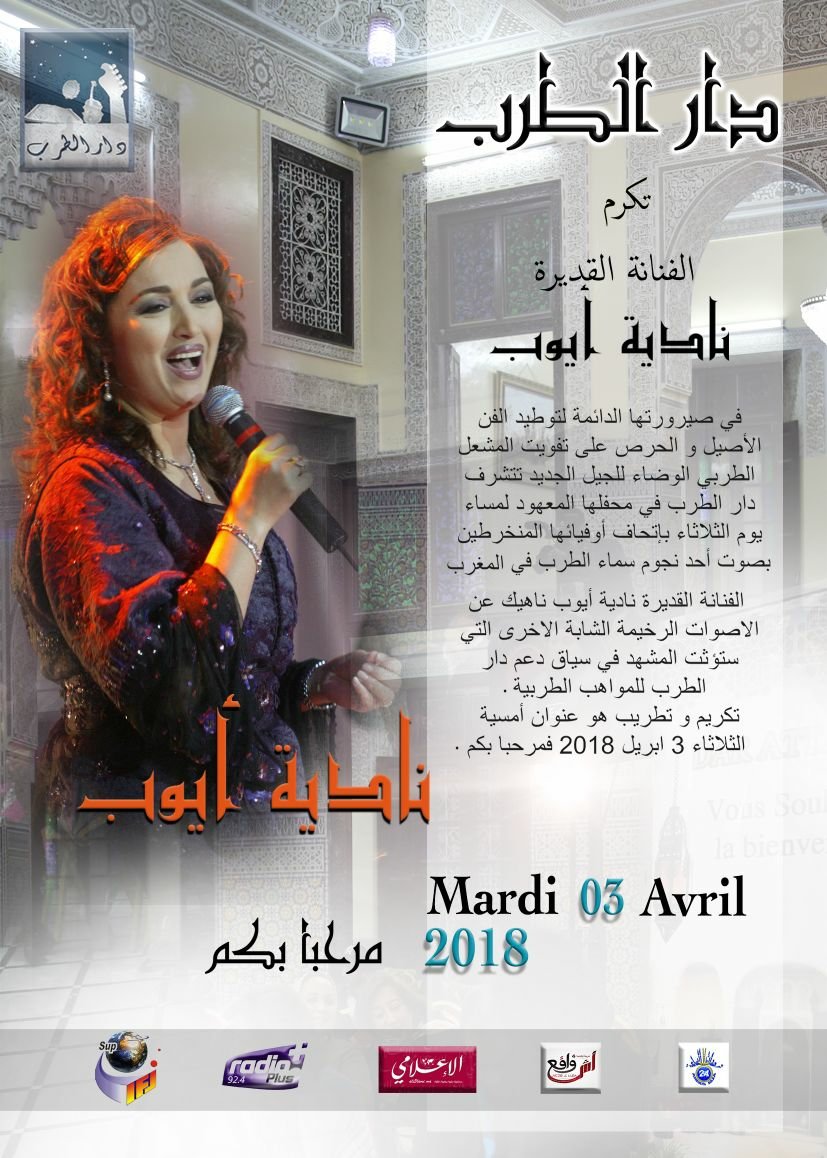 في إطار دعمها للمواهب الطربية، تجسيدا لمنهجها المستمر في توطيد الفن الأصيل و الحرص على تفويت المشعل الطربي الوضاء للجيل الجديد ، تنظم دار الطرب يوم غد الثلاثاء 3 أبريل الجاري ،أمسية تكريم و تطريب للفنانة القديرة و المتميزة نادية أيوب إلى جانب الأصوات الرخيمة الشابة الأخرى التي ستؤتث المشهد في سياق دعم دار الطرب للمواهب الطربية .