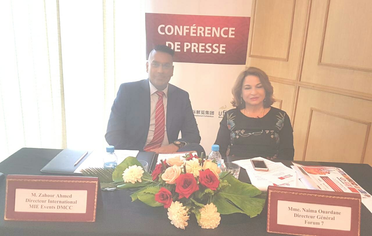 Ça sera pour le 6 , 7 et 8 décembre 2018 à la foire internationale de Casablanca ” Nous organisons l’événement China Trade.Un lieu de rencontres entre les professionnels Chinois et Marocains représentants de plusieurs secteurs économiques et bien entendu la chaleur du large public que nous accueillons les bras ouverts -entrée gratuite -“. Au micro de cette salle de l’hôtel Farah ( conférence de presse donnée lundi 26/11/2018 ) 3 pros des médias et des affaires . Ouardane Naima génie du Forum 7 , Zahoor Ahmed directeur international Events chez MIE GROUPS relayé par la charmante Mélanie Bazin De Bezons du même groupe .