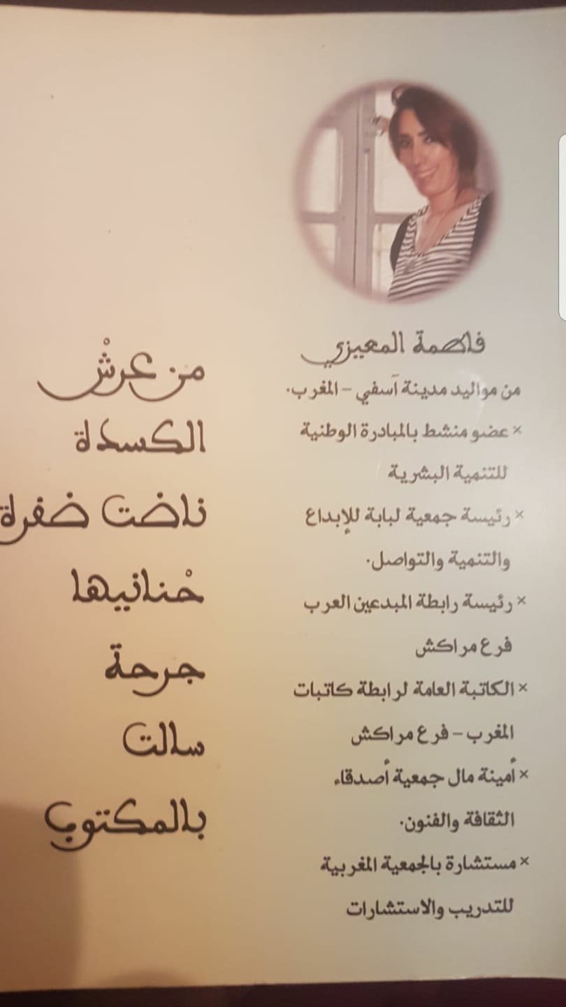 انها الشاعرة والزجالة فاطمة المعيزي النهر الهادر شعرا وزجلا، لها مؤلفات شعرية وزجلية رائعة اختارت لها عناوين تجذبك للاستمتاع بها، تختار الشاعرة فاطمة المعيزي عناوين مؤلفاتها بدقة متناهية تسحر القارىء.