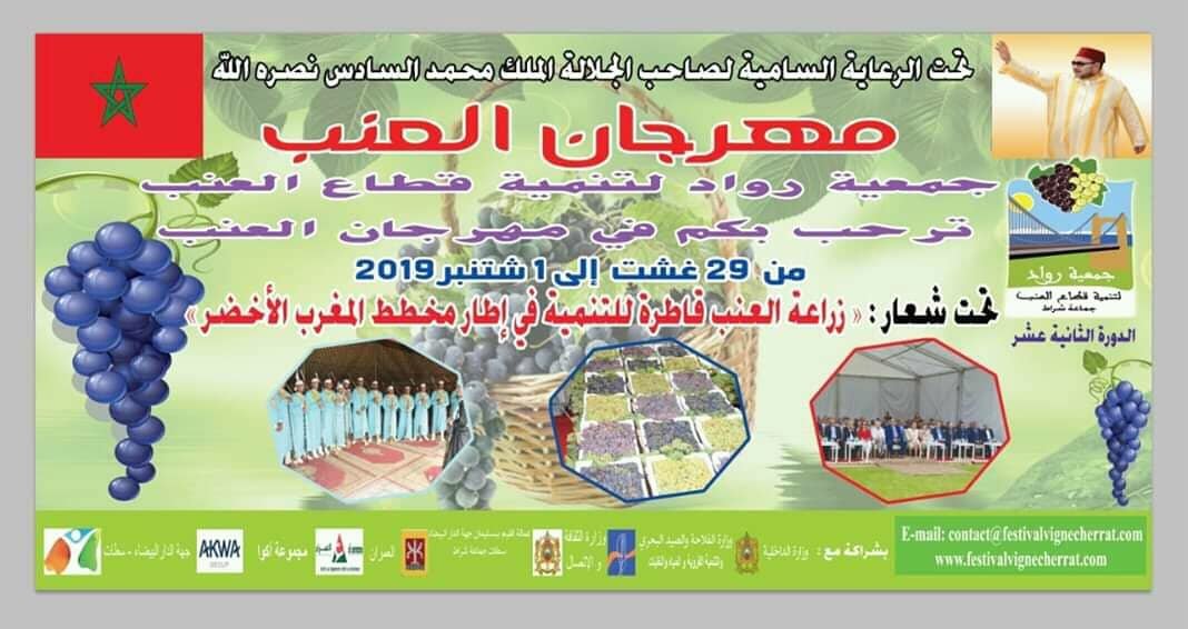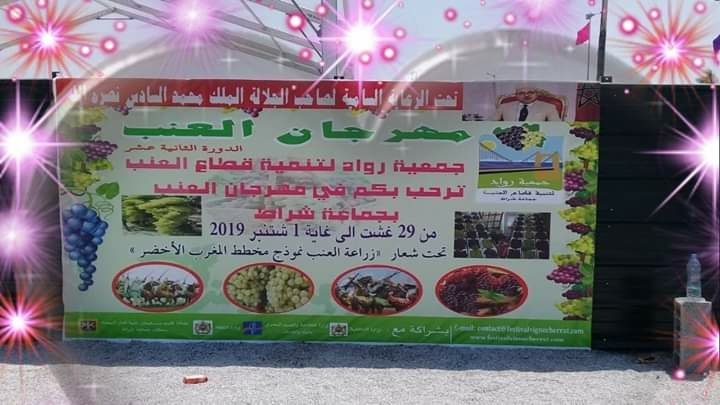 تعلن “جمعية رواد لتنمية قطاع العنب” إلى ساكنة جماعة شراط وإقليم بنسليمان،و إلى عموم الرأي العام الوطني أن الدورة الثانية عشر لمهرجان العنب ستنعقد خلال الفترة ما بين 29 غشت و 1 شتنبر 2019 بجماعة الشراط, والذي يحظى للمرة الثالثة على التوالي بالرعاية السامية لصاحب الجلالة الملك محمد السادس نصره الله , وينظم هذا المهرجان وفق برنامج غني ومتنوع ,بحيث من المنتظر أن تشكل هذه الدورة نقلة نوعية في مسار هذا المهرجان الواعد، الذي بات يحتل مكانة مرموقة ضمن شبكة المهرجانات الوطنية المتخصصة, وستتيح هذه الدورة كما هي العادة خلال الدورات السابقة لساكنة جماعة الشراط وإقليم بنسليمان, ولآلاف الزوار من مختلف جهات المملكة ومن مغاربة العالم، وطيلة أيام المهرجان فرصة للتعرف عن قرب على المؤهلات الكبيرة التي يزخر بها قطاع الكروم بالمنطقة ودوره الأساس في تسريع وتيرة التنمية الاقتصادية والاجتماعية والبشرية، وكذا الاستمتاع بأجناس مختلفة من الفنون التقليدية والعصرية، والعديد من الأنشطة الترفيهية المتنوعة الموجهة لمختلف الفئات العمرية .
