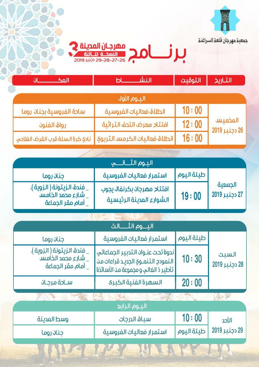 برنامج النسخة الثالثة من مهرجان المدينة بقلعة السراغنة هاته السنة غني ومتنوع في يومه الأول يلتقي الجمهور السرغيني وبالضبط عشاق التبوريدة والفروسية و رواق فني وفعاليات الكرمس التربوي.