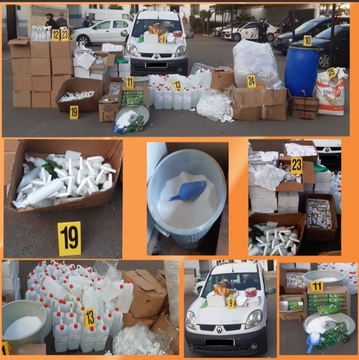 وذكر بلاغ للمديرية العامة للأمن الوطني ، أن مصالح الأمن كانت قد رصدت موادا للتطهير والتعقيم تحمل علامات تجارية مزيفة، تعرض للبيع في مواقع التواصل الاجتماعي، وهو ما استدعى فتح بحث في الموضوع أسفر عن توقيف سائق سيارة يتولى التوزيع في عدة نقط للبيع بمدينة الدار البيضاء، قبل أن يتم رصد ورشة سرية تستغل لإعداد وتحضير مواد التطهير والتعقيم انطلاقا من مواد كيميائية يجري حاليا القيام بالخبرات العلمية الضرورية من أجل تحديد طبيعتها ودرجة خطورتها.