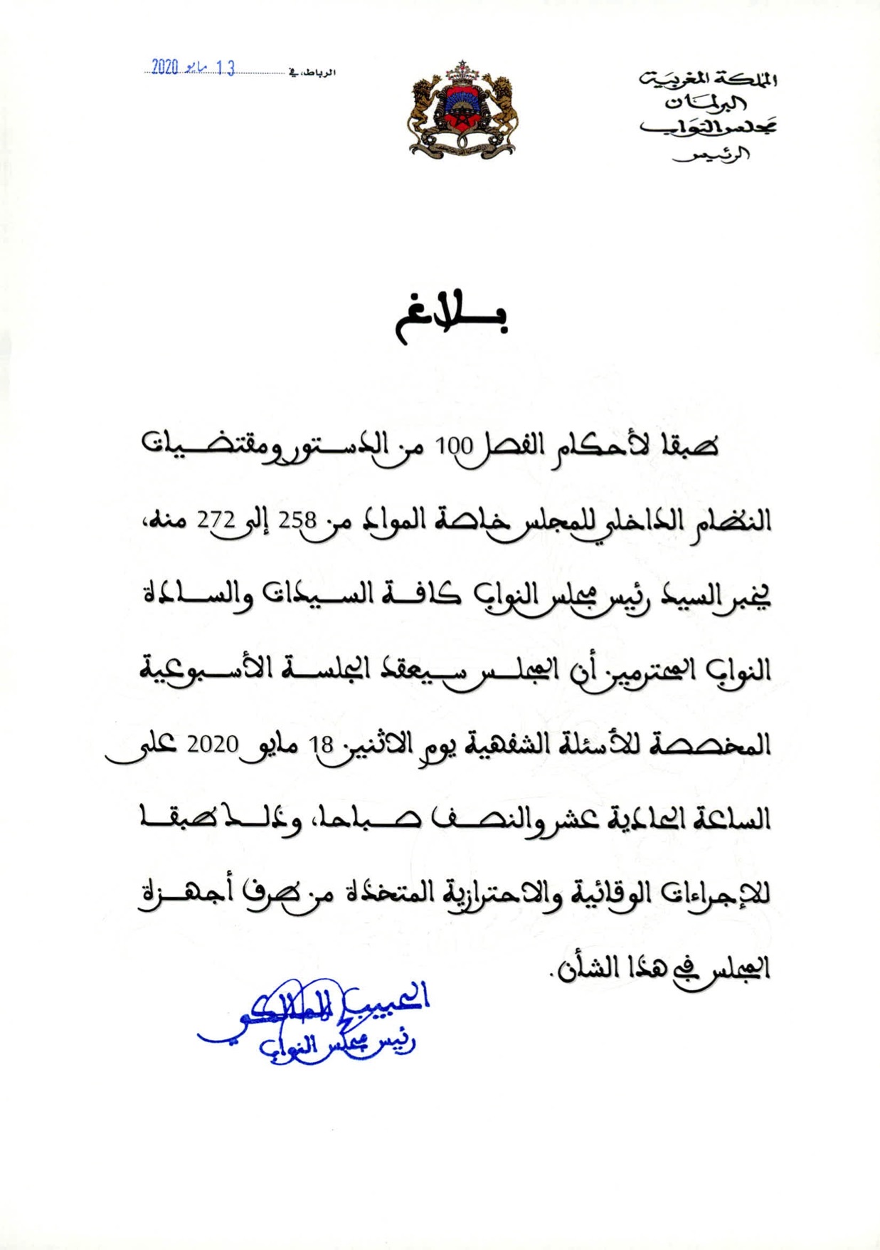 بلاغ الجلسة الاسبوعية المخصصة للأسئلة الشفهية الإثنين 18 ماي 2020 :