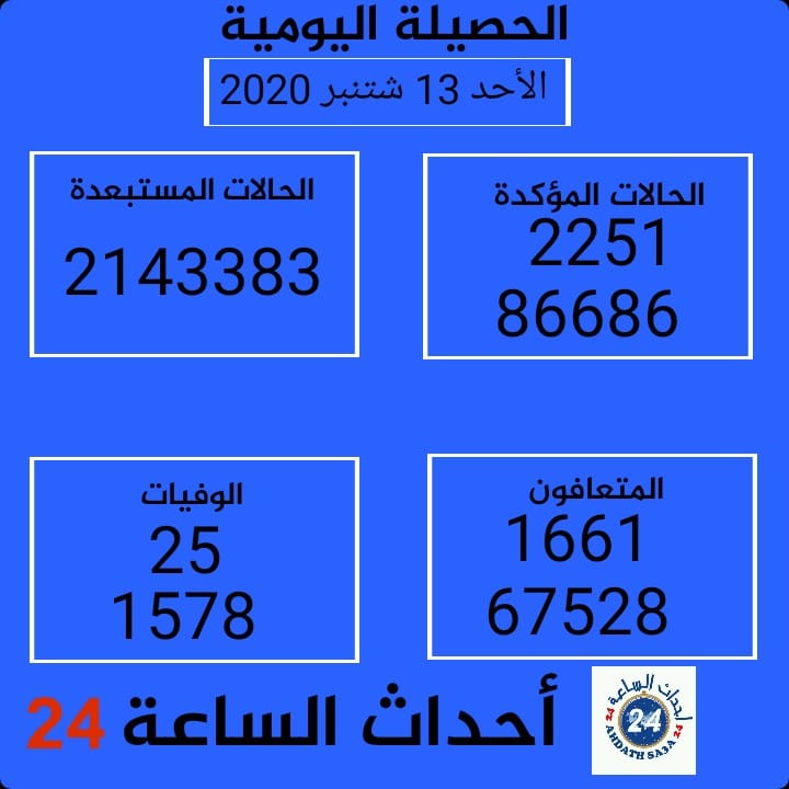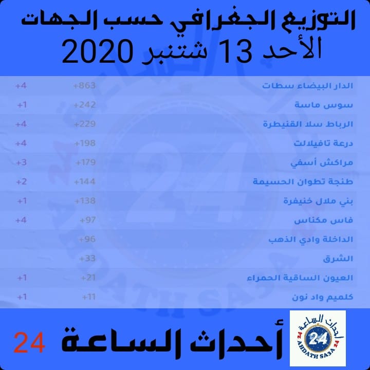 أهم مميزات أخر مستجدات الحالة الوبائية لفيروس #كورونا المستجد “#كوفيد19” في المغرب خلال الـ 24 ساعة الأخيرة، وذلك إلى حدود الساعة السادسة من مساء يوم الأحد 13 شتنبر 2020: