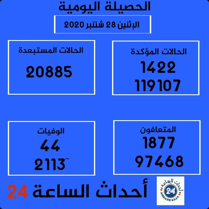 أعلنت وزارة الصحة، اليوم الإثنين، عن تسجيل 1422 إصابة جديدة بفيروس كورونا المستجد (كوفيد-19)، و1877 حالة شفاء، و44 حالة وفاة خلال الـ24 ساعة المنصرمة.
