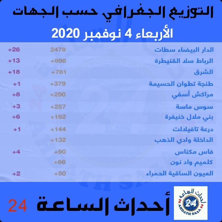 وأوضحت الوزارة، في النشرة اليومية لنتائج الرصد الوبائي لـ(كوفيد-19)، أن الحصيلة الجديدة رفعت العدد الإجمالي لحالات الإصابة المؤكدة بالمملكة إلى 235 ألفا و310 حالة منذ الإعلان عن أول حالة في 2 مارس الماضي، ومجموع حالات الشفاء التام إلى 193 ألف و886 حالات بنسبة تعاف تبلغ 82.4 في المائة، فيما ارتفع عدد الوفيات إلى 3982 حالة، لتستقر نسبة الفتك عند 1,7 في المائة.