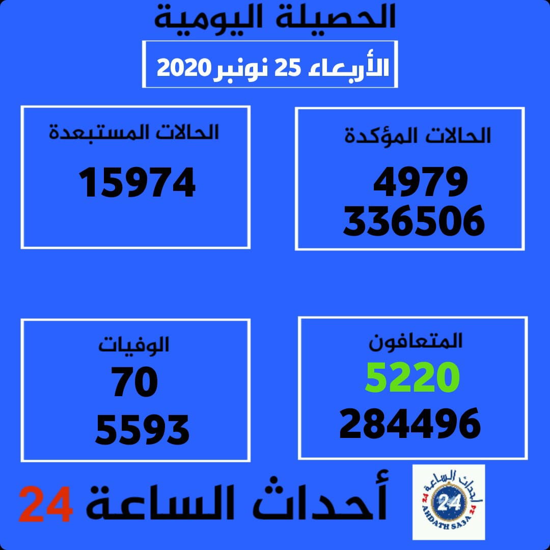 تسجيل 4979 إصابة جديدة بفيروس كورونا المستجد (كوفيد-19)، و5220 حالة شفاء، و70 حالة وفاة خلال الـ24 ساعة الماضية.