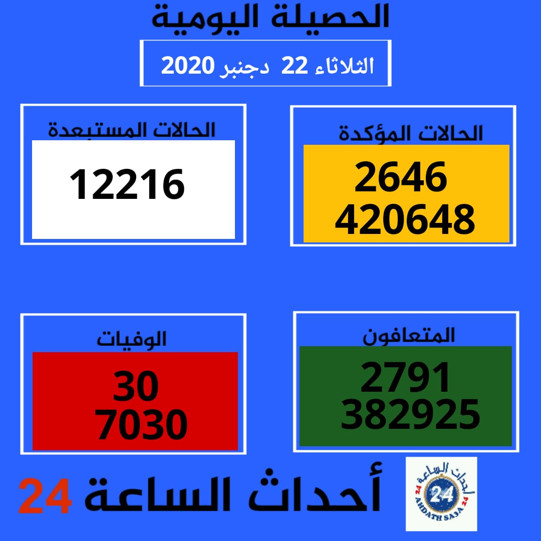 كما أشارت وزارة الصحة إلى أنه تم التأكد من 2791 حالة شفاء إضافية ليبلغ إجمالي التعافي 382925 فيما عرفت الفترة نفسها عرفت تسجيل 30 وفاة جديدة ليصل عدد الوفيات إلى 7030حالة.