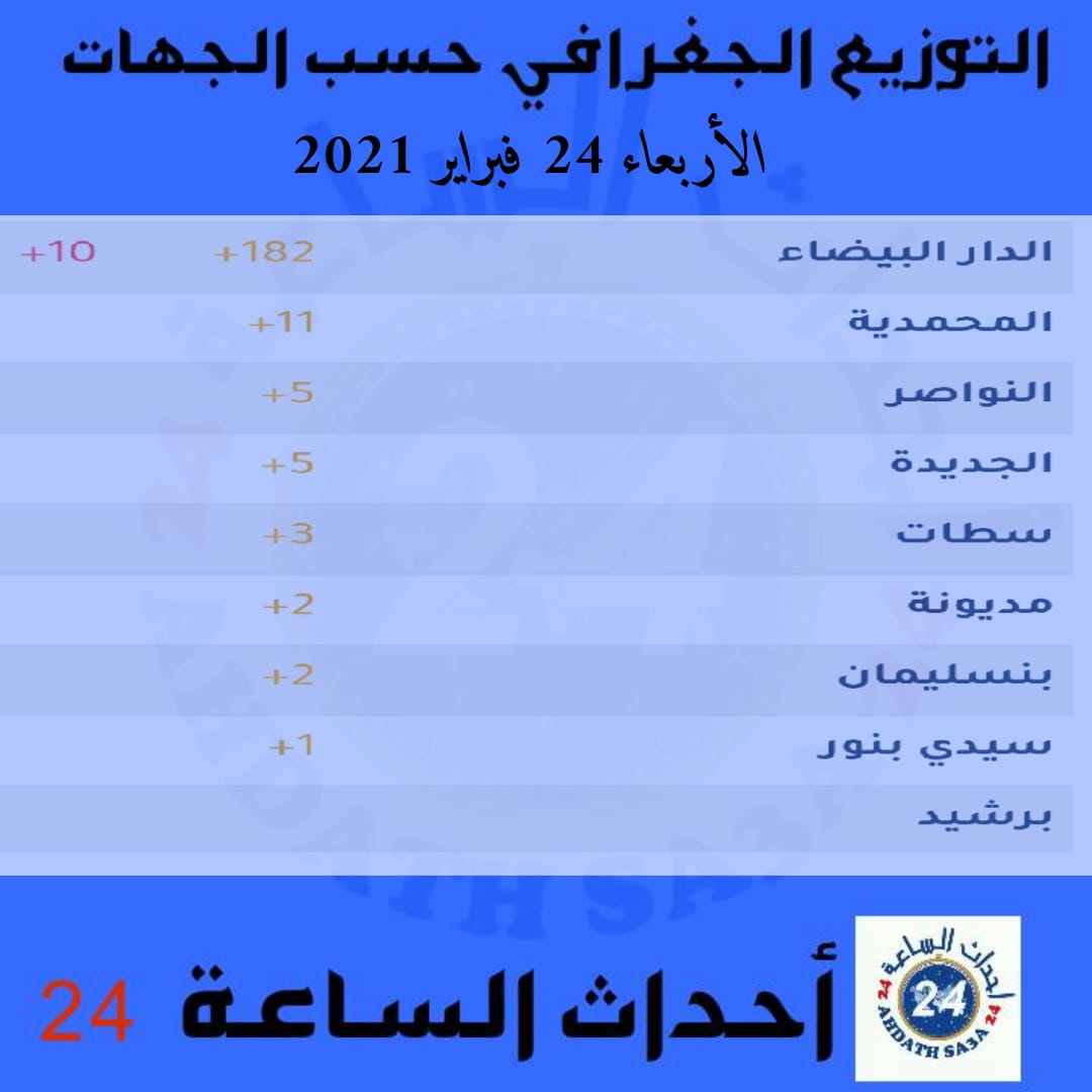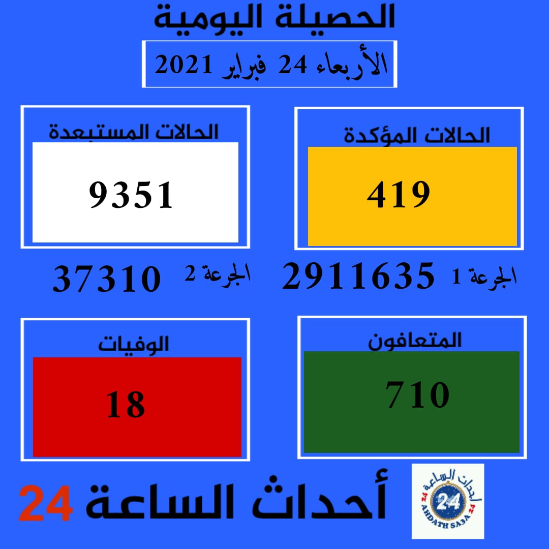 أعلنت وزارة الصحة، اليوم الأربعاء، تسجيل 419 إصابة جديدة بفيروس “كورونا” ليرتفع العدد الإجمالي للمصابين بالفيروس إلى 482128 حالات في المملكةوتابعت الوزارة بأن مجموع التحاليل المنجزة، عقب إجراء 9351 فحصا خلال نفس اليوم، قد بلغ 5129731 منذ بداية انتشار الفيروس. وعرفت تسجيل 18 وفاة جديدة في البلاد ليصل العدد إلى 8592.وتأكدت الوزارة من شفاء 710 حالة إضافية ليبلغ إجمالي التعافي 466815.وإستفاد هذا اليوم 275776 من اللقاح ليصل العدد إلى2911635 .ووصل عدد المستفيدين من الجرعة الثانية 37310 مستفيد. الحالات الخطيرة والحرجة المصابة بفيروس كورونا بالمغرب تبلغ إلى حدود مساء اليوم الأربعاء 437، من بينها 33 حالة تحت التنفس الاصطناعي الإختراقي.وتهيب وزارة الصحة بالمواطنات والمواطنين الالتزام بقواعد النظافة والسلامة الصحية، والانخراط في التدابير الاحترازية التي اتخذتها السلطات المغربية بكل وطنية ومسؤولية.