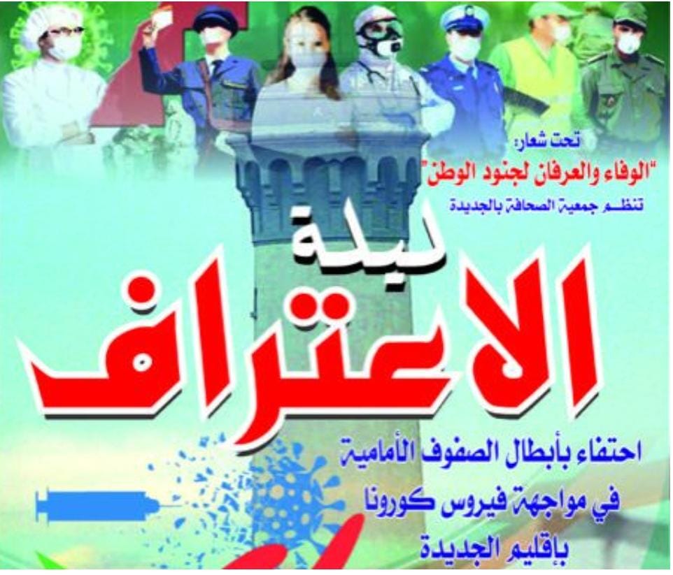 ترسيخا لثقافة الاعتراف، وتثمينا للمجهودات الجبارة التي قامت بها المملكة المغربية لمواجهة أشد الأزمات، والتوجيهات السامية لصاحب الجلالة الملك محمد السادس نصره الله، وكذا جهود الجهات المسؤولة في الدولة المغربية لمواجهة وباء فيروس كورونا، وتحت شعار “الوفاء والعرفان لجنود الوطن” تنظم جمعية الصحافة بالجديدة يوم الجمعة 25 يونيو 2021 ابتداء من الساعة السادسة والنصف مساء بقاعة علي بابا بالجديدة، حفل “ليلة الاعتراف”احتفاء بأبطال الصفوف الأمامية في مواجهة فيروس كورونا بإقليم الجديدة.