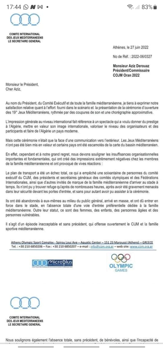 وجهت اللجنة الدولية لألعاب البحر الأبيض المتوسط، رسالة شديدة اللهجة إلى الجزائر، تضمنت مجموعة الانتقادات اللاذعة، بسبب العديد من الأخطاء التنظيمية والاختلالات التي شهدتها النسخة الـ 19 المقامة حاليا بوهران.
