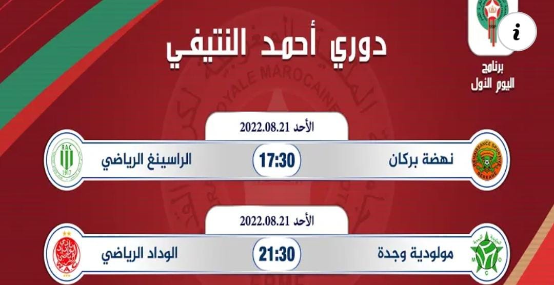 تقوم قناة “الرياضية” ابتداء من اليوم الأحد وإلى غاية السبت المقبل 27 غشت، بالنقل المباشر لمباريات دوري أحمد النتيفي في نسخته 34، بمشاركة الوداد الرياضي البيضاوي حامل اللقب، والراسينع البيضاوي، ونهضة بركان الفائز بكأس العرش، والمولودية الوجدية.