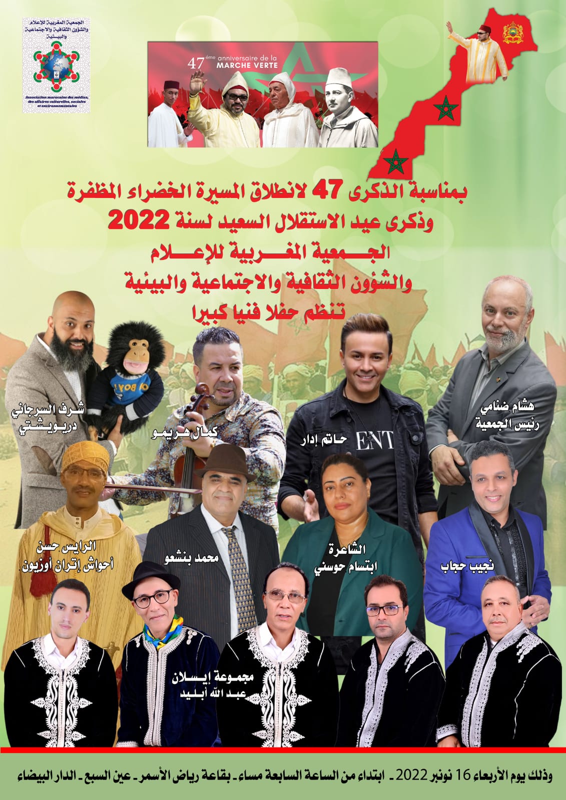 تنظم الجمعية ” المغربية للإعلام والشؤون الثقافية و الاجتماعية والبيئية ” حفل افتتاح نشاطها وذلك يوم الأربعاء 16 نونبر 2022 على الساعة السابعة مساءا بقاعة رياض الأسمر عين السبع بالبيضاء.وبهذه المناسبة تتشرف الجمعية بدعوة كافة الفاعلين الجمعويين بالمدينة لحضور اشغال هذا النشاط الذي يصادف ذكرى عيد الاستقلال المجيد وذكرى المسيرة الخضراء المظفرة.
