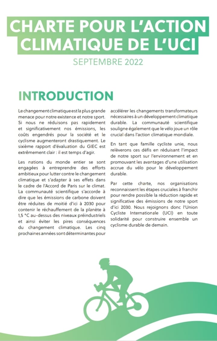 وكان الموقعون المؤسسون قد التزموا باحترام ميثاق العمل المناخي الذي اعتمده المكتب المديري للاتحاد الدولي للدراجات في شتنبر 2022.