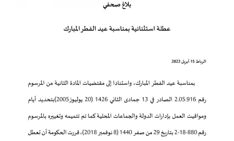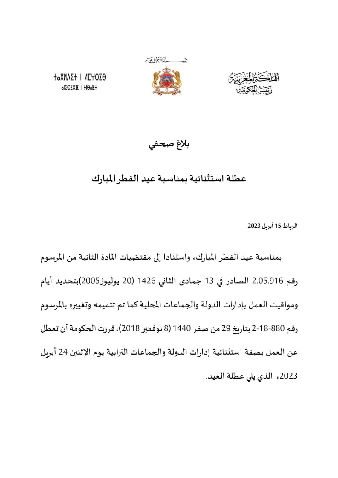 قررت الحكومة أن تعطل عن العمل بصفة استثنائية إدارات الدولة والجماعات ‏الترابية ‏يوم الإثنين 24 أبريل الجاري، الذي يلي عطلة عيد الفطر السعيد.