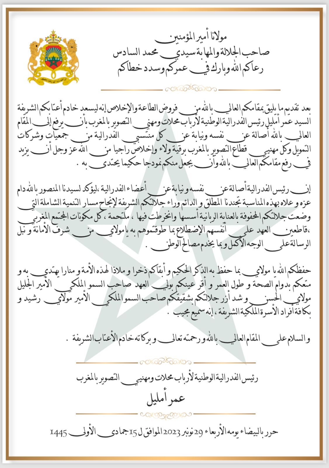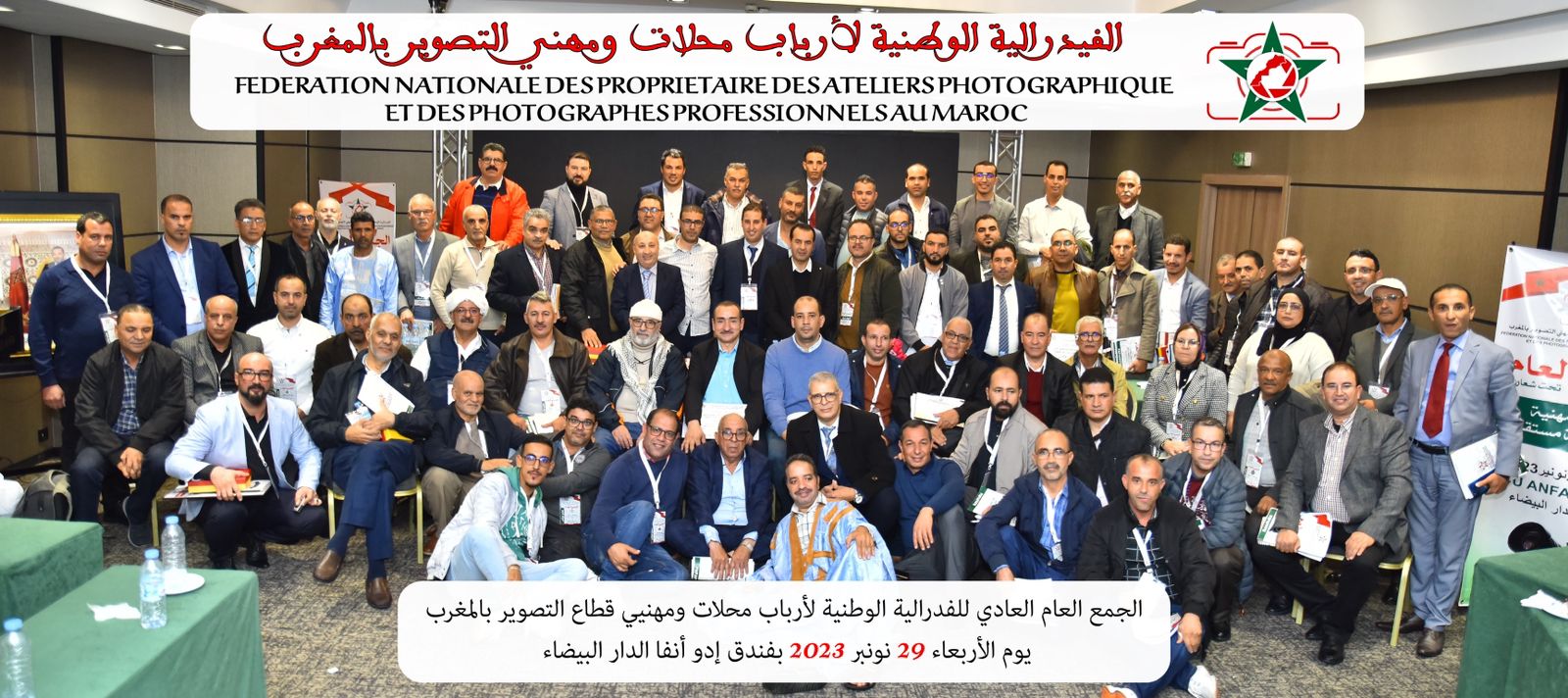 انعقد بتاريخ 29 نونبر 2023 ابتداء من الساعة التاسعة صباحا بفندق ادو انفا الجمع العام العادي للفدرالية الوطنية لأرباب محلات و مهنيي التصوير بالمغرب حيث تم خلاله تلاوة و المصادقة على التقريرين الأدبي و المالي للفدرالية بعدها انتقل الجمع إلى انتخاب المكتب الجديد بعد أن قدم المكتب السابق استقالته حيث تم انتخاب السيد : عمر أومليل رئيسا جديدا للفدرالية و ترك له الجمع صلاحية اختيار المكتب المسير