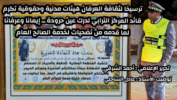 إرتأت المنظمة الوطنية للحقوق والحريات وجمعية أرض بلادي للتنمية المستدامة ومجلة رأي المواطن والجمعية الوطنية للرياضة والبيئة أن يعملوا على تكريم السيد مصطفى بويج رئيس المركز الترابي لدرك عين حرودة إيمانا منهم وعرفانا لما قدمه هدا الأخير من تضحيات جسام للصالح العام ، حيث يعتبر من رجال الدرك الذين افنوا اعمارهم لخدمة هذا الوطن بكل تفان و وطنية ونكران للذات ، وبعد اجتماع تم بالمكتب التنفيذي للمنظمة الوطنية للحقوق والحريات اتفق الجميع و بالاجماع على منحه شهادة تقديرية مختومة بأربعة اختام اعترافا له بالدور الكبير الذي لعبه في محاربة الجريمة وإستثباب الأمن مند تعيينه على رأس المركز الترابي لدرك عين حرودة فبحسب البحث الذي أجري من قبل منتدبي المكتب التنفيذي للمنظمة الوطنية للحقوق والحريات وجمعية أرض بلادي للتنمية المستدامة ومجلة رأي المواطن والجمعية الوطنية للرياضة والبيئة وبناءا على إستطلاع للرأي وجس النبض بعين حرودة بخصوص ظاهرة الاتجار في الممنوعات بمختلف أنواعها حيث توصلوا الى العشرات من الأسر و أكدو على أن قائد المركز الترابي لدرك عين حرودة عمل رفقة عناصره على تجفيف منابع تجار المخدرات بشكل كامل و ان بعض الغرباء يترددون على المنطقة بين الفنية والاخرى مستغلين وعورة المسالك والطرق الغير المعبدة وإنعدام الانارة العمومية في بعض المناطق لإفساد الناشئة وترويج السموم حيث أكدت ساكنة المنطقة ان قائد المركز و فور إلتحاقه بعين حرودة عمل على إيقاف ما يقارب 70 سبعين شخصاً يتوزعون بين تجار المخدرات ومعاونيهم كما عمل على هدم وإخلاء مجموعة من الاوكار التي كانت متخصصة في ترويج المخدرات ، كما تشير المصادر أن قائد المركز رفقة عناصره عمل على ملاحقة و تتبع الغرباء والحد من تحركاتهم الذين يستغلون سيارات رباعية الدفع و يترددون على منطقة عين حرودة حيث تمت الإطاحة مؤخراً بأحدهم كان مرفوقا بزوجته تم ضبطهم وهم في حالة تلبس وقد اسفرت عملية الإيقاف على حجز سيارة سوداء رباعية الدفع و ما يقارب خمس كيلوجرامات من مخدر الشيرا الشيء الذي اثار إستحسان الساكنة كما تشير الفعاليات أنها عاينت الحملات الأمنية المتواصلة ليلا ونهارا … كما عرفت منطقة عين حرودة تغييرا جدريا حيث يلاحظ وبالملموس فرق كبير بين الأمس واليوم وهو ما عبرت عنه فعاليات المجتمع المدني للدور المهم الذي يلعبه المركز القضائي لدرك المحمدية في المؤازرة وتقديم الدعم كما اشادت بالجهود المبذولة من لدن قائد السرية الأخير الذي يتابع كل كبيرة وصغيرة ويحث على التقيد بتعليمات القيادة الجهوية والمركزية في استثباب الأمن بشكل جيد وحماية المواطن والحفاظ على الممتلكات.