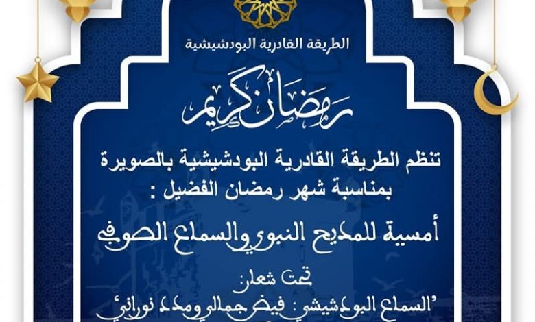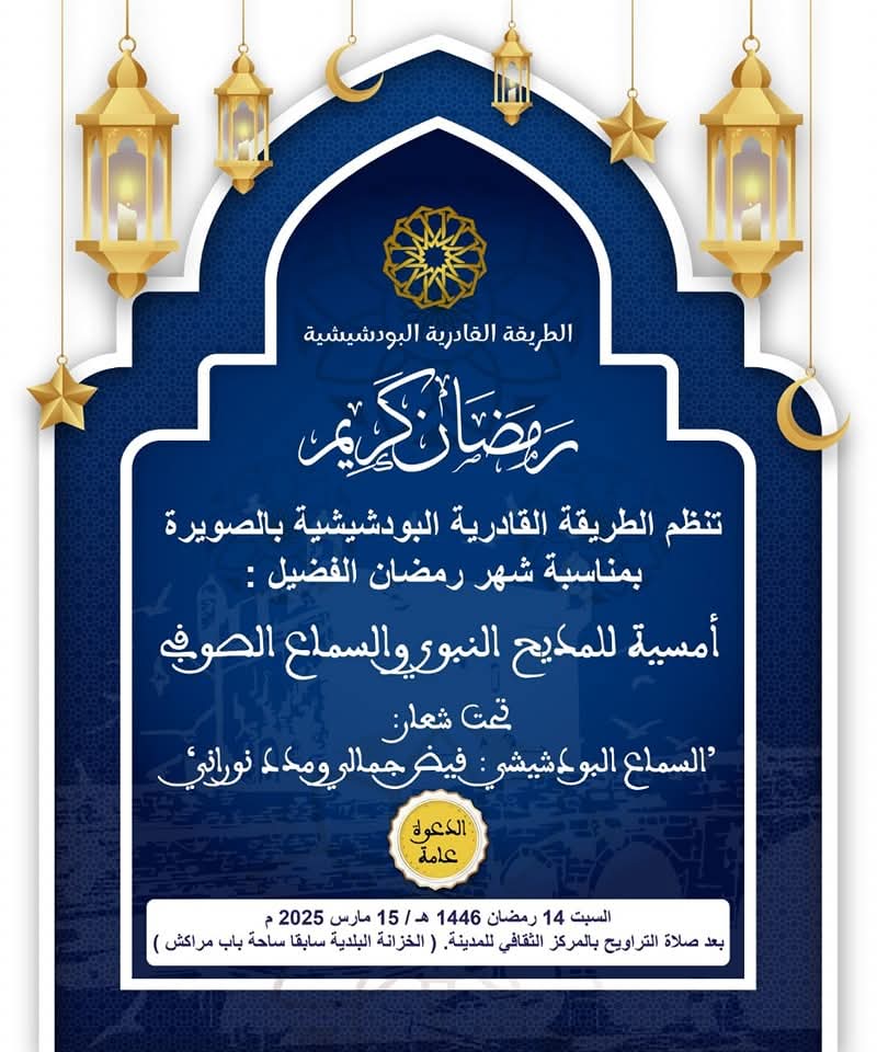 في أجواء روحانية مفعمة بالنفحات الإيمانية لشهر رمضان المبارك، تستعد مدينة الصويرة لاحتضان أمسية متميزة للمديح النبوي والسماع الصوفي، من تنظيم الطريقة القادرية البودشيشية. هذه المبادرة تأتي احتفاءً بهذا الشهر الفضيل، حيث يجتمع المريدون وعشاق السماع الصوفي في لقاء ينشد الصفاء الروحي والتقرب إلى الله عبر الكلمة واللحن.